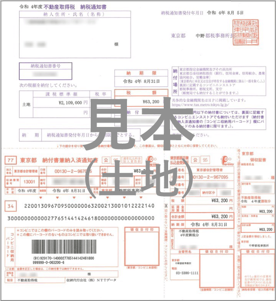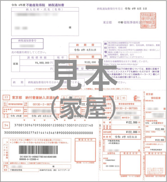 ご所有されてから1年半を目安に課税されます。納付書が届く前に「不動産取得税のお知らせ」も届きます。