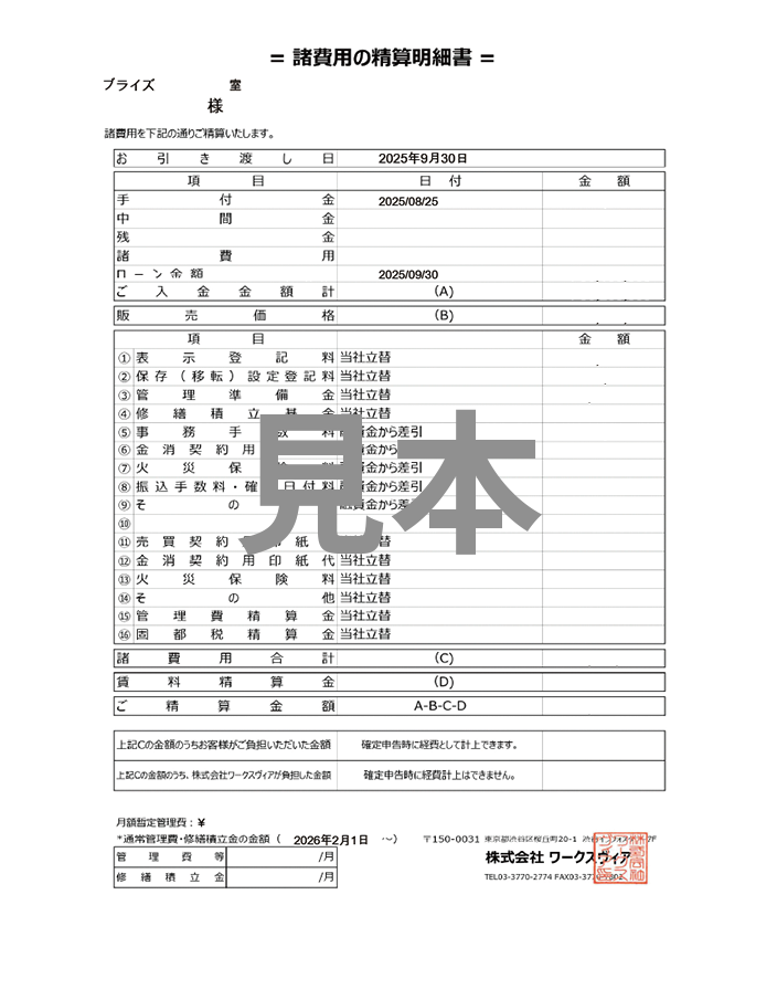 サンプル(見本)として、弊グループから発行させて頂いている【諸費用の精算明細書】を添付致しております。これと類似した書類をご用意ください。